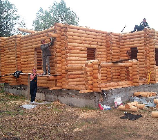 Далее специальная бригада выполнила контрольную сборку дома, каждое бревно было помечено метками (обычно — номер бревна и узел), после — дом разобрали, перевезли на участок и снова собрали на фундаменте. Теперь уже — с применением утеплителей и специальных крепежных элементов. Привезенные бревна укладывали на фундамент в определенном порядке по часовой стрелке. Система крепежа дома из оцилиндрованного бревна имеет свои особенности: бревна крепятся друг к другу без клея и гвоздей, а посредством нагеля — специальной деревянной шпильки. Нагели расположены в определенном порядке, соединяют бревна и не дают им скользить в процессе усадки дома.