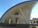 Все здание обрамляется большепролетной клееной деревянной конструкцией, формируя округлую форму фасада. Соединенные встык без зазора деревянные элементы одновременно обеспечивают термоизоляцию и защиту от атмосферного воздействия.