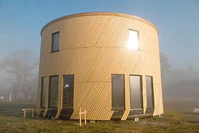Круглый фасад Дома-«улья» по задумке архитекторов облицован открытой составной обшивкой из приморской сосны. Такой финишный облицовочный материал долговечен и экологичен, однако не обеспечивает должной гидроизоляции всего стенового пирога.
