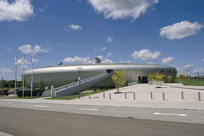 Внешний слой стеновой конструкции выполнен из алюминиевых облицовочных плит, формирующих округлую форму здания, словно перетекая с крыши на фасад. Ряды больших окон на крыше обеспечивают доступ дневного света внутрь здания.