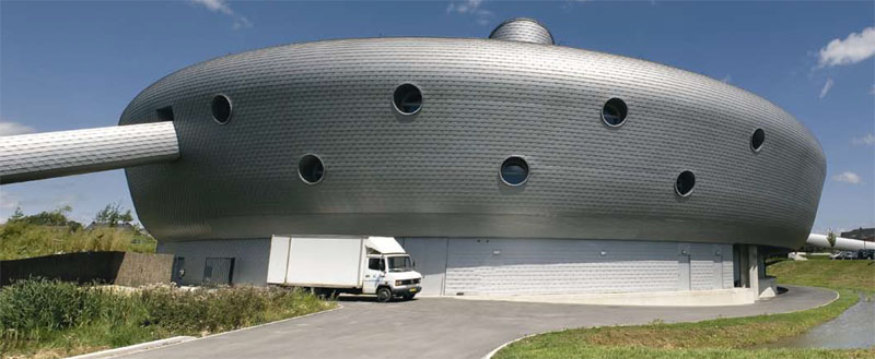 С аналогичной задачей столкнулись создатели спортивно-развлекательного центра Les Thermes, построенного в окрестностях городов Страссен и Бертранж в Люксембурге. Необыкновенная форма данного объекта, спроектированная консорциумом архитекторов в составе Witry & Witry, Jim Clemes Architectes и Hermann & Valentiny et Associes, напоминает космический корабль, неожиданно приземлившийся на горизонте. Общая концепция дизайна центра основана на идее прозрачности, оставляя открытыми значительную часть внутренних помещений здания и демонстрируя богатые возможности для отдыха и спорта, предлагаемые центром.