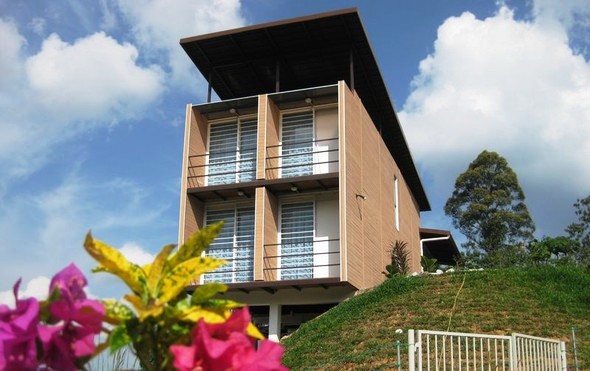 Еще одно удивительное творение получилось у дизайнера Кена Квока (Ken Kwok), из малоазийского архитектурного бюро Anand Bungalow. Только он сделал акцент на экологическое проектирование, с помощью которого можно значительно сэкономить на электричестве и природных ресурсах. Планировка фасадов и комнат в его домах продумана таким образом, что бы было можно по максимуму использовать естественное освещение. Еще один нюанс помогающий беречь электроэнергию – грамотное устройство естественной вентиляции и правильная циркуляция воздуха в доме. Также, дом оснащен системой для сбора дождевой воды и приспособлениями для экономии проточной.