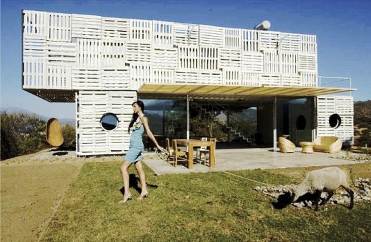Внешние стены дома отделаны деревянными паллетами, которые и выполняют функцию жалюзи и поддерживают оптимальную температуру. Кроме того, такое стеновое решение смориться очень эстетично. Большинство стенок контейнера, заменено на стеклопакеты. Благодаря этому дом получается очень просторным. Внутренне убранство дома выдержано в минимализме – это прекрасно гармонирует с простыми формами постройки.